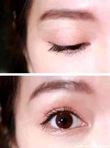 步骤二:接下来开始眼影的部分了,只需要用两个颜色,不要用太沉重的颜色,反而把本身的眼褶隐形了,先用橘粉色珠光眼影帮上眼皮打底,使用小刷子让下眼影也画上橘粉色,珠光白打亮眉骨,泪沟,眼外皮C处,让眼神透亮又干净。