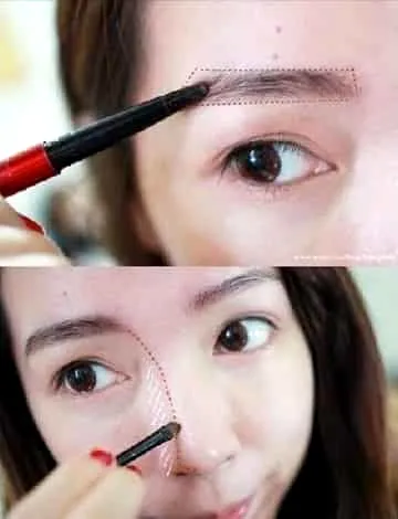 步骤三:使用眉笔填补眉毛空隙,画出自己喜欢的眉型,接着还稍微画一下鼻影,因为妆比较淡,所以希望轮廓立体一些,沿着咖啡色线条轻轻的使用余粉来画鼻影,再沿着白线方向,使用干净的刷子刷开。