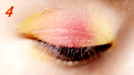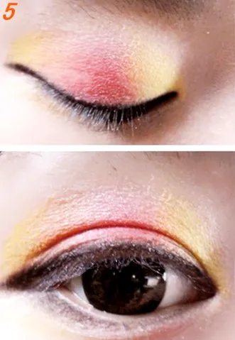 步骤三:**一贯是种能调整情绪,让人变得更加快乐的色彩,所以为什么不用一抹太阳色来点亮你一天的枯燥生活呢?在用**眼影在眼皮靠近眼头处,进行颜色的点压。这样颜色的纯度跟饱和度会高一些,然后在眼尾的红色眼影上,用**进行晕染。