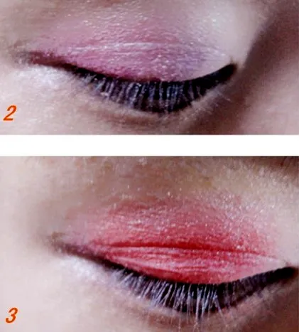 步骤二:在银色上叠加红色眼影位置在眼皮的中样略往眼尾带过,让双眼具有立体感。接着在眼影笔在下眼睑描绘眼线,将眼头的三分之一留白,之描绘眼尾方向的三分之二。