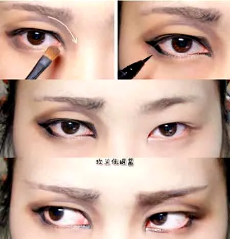 Step2:接着用眉笔在眉毛的下方画上一条,前三分之一左右的位置要宽一些,接着用刷子刷开,眼线的画法也很简单,一条粗眼线就OK了,眼尾记得要如同燕尾一般,上翘成倒三角,再用眉笔扫开,眼头的位置用眉笔画出90度的样子。