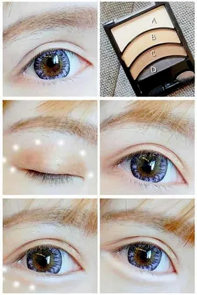 Step1:底妆自然是不用说,BB霜搭配粉底就OK了,然后带上美瞳,贴**眼皮贴,准备好眼影盘中的B眼影,然后先将整个眼窝全部涂抹好,再将B涂抹在下眼脸,营造出阴影的效果,这样会更加突出卧蚕。