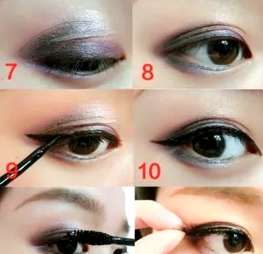 步骤三:接下来用褐色的眼影加深后眼窝和下眼尾。然后画好上眼线,眼尾处拖长稍稍往上翘,这样就能令双眼看起来更有神,然后贴好假睫毛,眼睛迅速变大哦!