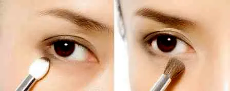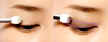 步骤1:以淡色眼影在整个眼窝,可以稍微打出一点层次感。选用暗色系眼影打在上眼睑部位,范围大概为图中所示,在眼尾处可稍微扩大加深颜色。