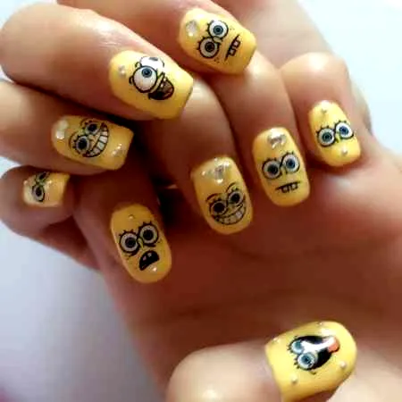 看过海绵宝宝动漫片的妹子一定认识这款美甲!超有爱的美甲,抢眼的**作为底色,上面的栩栩如生的海绵宝宝表情,各种变换的表情如此生动,**时尚。