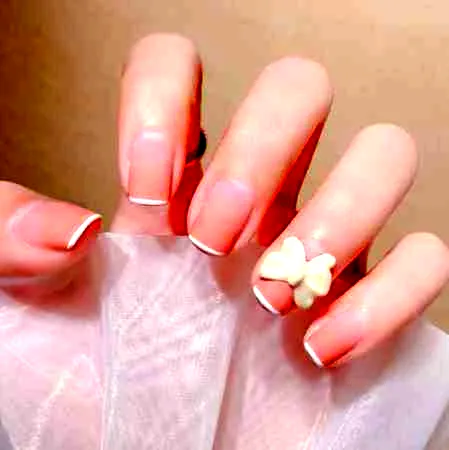 step1:将全部的指甲整理干净之后,在大拇指,食指,中指和无名指涂上裸粉色的指甲油,在无名指涂上白色指甲油。