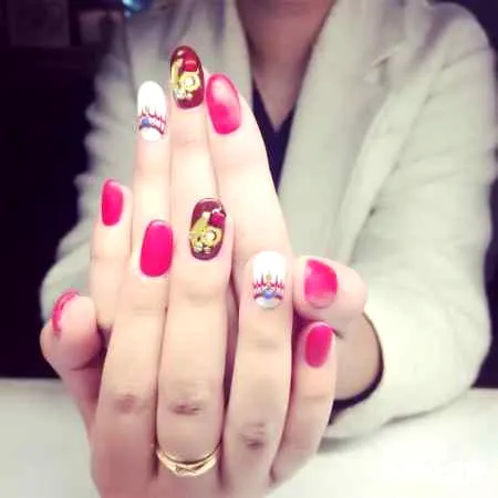 step3:再用美甲描绘笔分别蘸取红色、白色和粉色的指甲油,在食指、中指和尾指的甲面上画出如图所示的图案造型,而不同的颜色或者画风,都可以根据自己的喜好而选择。