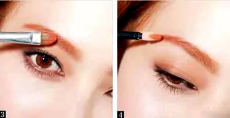 步骤三、趁眉胶没干之前,刷上橘色眼影定色,利用眉胶让眼影吸附。