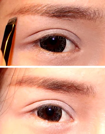 步骤三:选择一款与发色相近的眉笔,先描绘出眉形,然后再用眉粉轻轻扫上一层,自然立体的眉毛就打造完成啦!