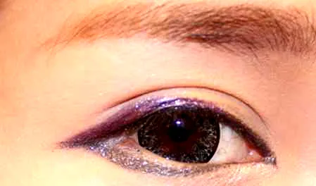 步骤五:然后用紫色的眼线笔画出类似眼影的感觉,下眼睑用灰色眼线笔描绘一下,大眼的裸妆感就打造出来了。