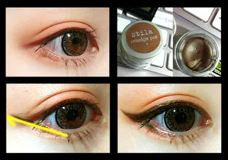 step3:在眼影部分完成之后,对睫毛开始根部的位置画上眼线,可以选取棕色眼线膏 效果好 又很持久 性价比非常高!