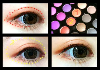 step2:接着开始涂抹眼影部分,选取88色眼影盘中标注1,2的橘色眼影,将1号色均匀涂抹在划**的位置。2号色在黄框区域内大面积铺开,做自然的晕染和过渡。
