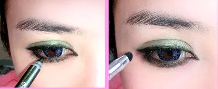 step2:如果眼影选用绿色的,画眼线要用那种绿色带闪的眼线笔,根据自己的眼形贴近睫毛根部轻轻画一条就可以了,内眼线也要填满。