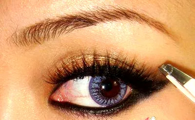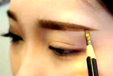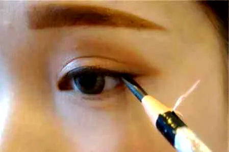 利用浅棕色的眼影在上眼皮尾端的三分之二处,均匀上色,尾部可以上色着重些。