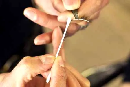 第七步:用镊子或者手拿起假睫毛从内侧向外侧粘过去,不过镊子会更精准。如果发现某个地方没贴好,可以赶紧进行调整,因为这个时候胶水还未完全干燥。