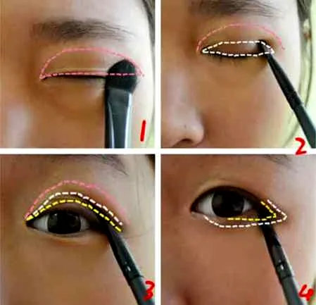 step3:颜色都不是很深,先用棕色涂散于眼窝,然后在虚线二处涂深一号颜色,最后用黑色沿着睫毛根部轻描,然后在轻描下眼角眼尾部分,如图4。