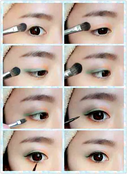 Step 3:用眼影刷沾上白色的高光先在眼皮上打底,在用橙色填满眼皮,接着用绿色从眼角的位置开始往后刷,形成微微上翘的感觉,在眉毛下方用银灰色打造层次感,用小刷子蘸取一点橙色的眼影,涂在下眼角,有放大眼角的作用。接着画眼线,用眼线笔贴着睫毛根部打造成上翘的形状,再在眼珠下方的睫毛根部,轻轻画上一条短短的眼线,使眼睛看起来更深邃。