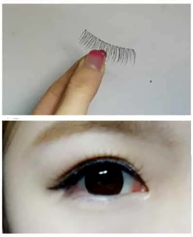 step4:再在睫毛根部佩戴好自然型的假睫毛,粘贴的时候要在睫毛根部多涂点胶水,以免睫毛掉落。