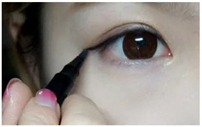 step3:然后用黑色的眼线笔(有那种眼线笔液态状态的笔卖),紧贴着睫毛根部描绘出细细的眼线,在眼尾处适当的拉长可以营造出无辜的感觉。