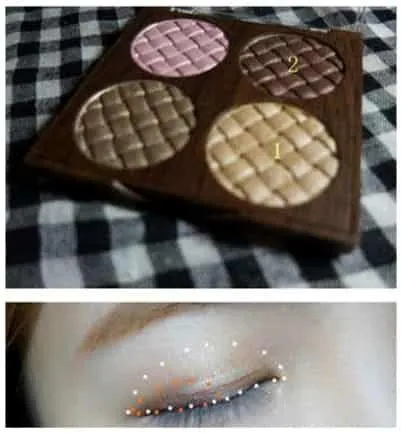 step2:为了让眼妆简洁,我们要用到的是浅棕色和棕色眼影,用浅棕色的眼影在整个眼窝处涂抹打底,再用棕色的眼影涂抹在双眼皮和睫毛根部之间。