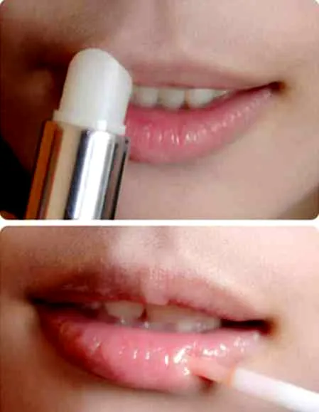 Step 5:先涂一层没有颜色的润唇膏打底,再将裸色的唇彩涂在嘴唇中间,水**的嘴唇营建出一种立体感。