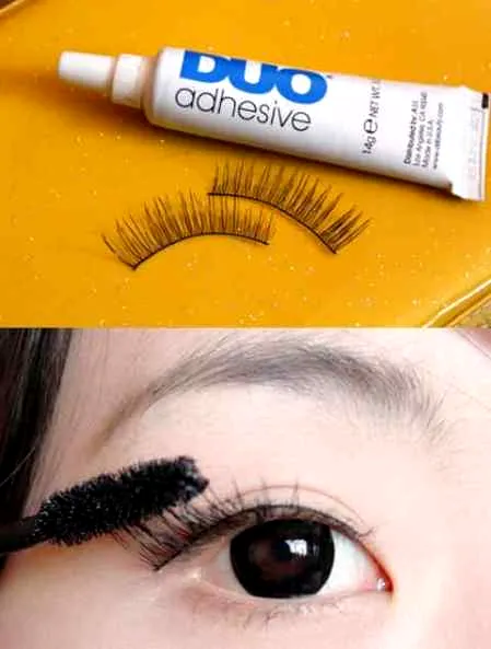 Step 3:裸妆不能少了假睫毛,接下来就是贴假睫毛的过程了,打造裸妆还有一个要点就是自然,所以MM要挑选自然款的假睫毛,涂上睫毛胶水,贴在上眼皮的位置,还可以制造出眼线的效果。