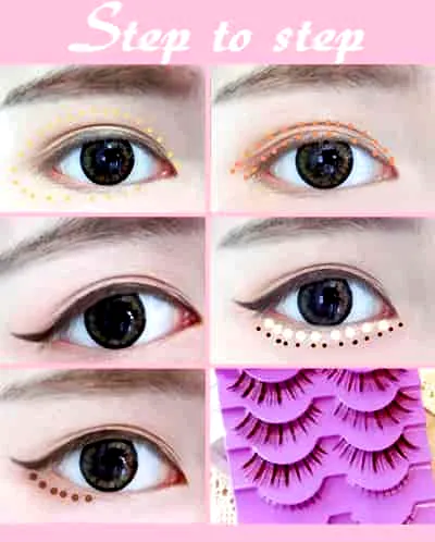 Step2:为了让眼影显色,必须有打底的工作。在整个眼部轻刷杏色眼影,再用棕色眼影将双眼皮的位置填满。用棕色眼线笔勾画眼线,这样能避免突兀和死板。想要俏皮点,可以将眼尾水平拉长,营造猫咪的乖巧感。利用卧蚕笔在下眼睑的位置轻涂,再用棕色眼影晕染下眼睑尾部,最后粘上假睫毛就完成了眼妆部分。