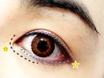 步骤二:然后用淡粉色眼影大面积的涂满整个眼窝,接着用大地色眼影涂在上眼皮的褶皱处,营造出渐变的效果,然后使用灰黑色眼影当作眼线晕染一下,眼头打上白色的珠光粉。