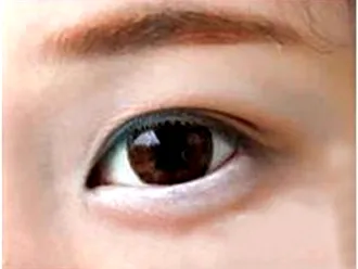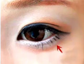 STEP4:画卧蚕,保持微笑,用棕色眼影沿着突出的位置画出一条线,再用白色眼影笔画下眼线,用棉签晕染开来。