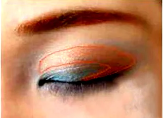 STEP3:现在开始画眼妆部分了,用银色眼影扫满整个眼窝,然后用浅蓝色眼影把眼皮褶皱处填满,再用橙色眼影把银色眼影包围晕染。