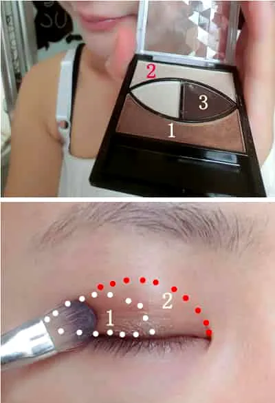 STEP 2:用淡棕色的1号眼影在眼窝后端涂抹开,接着用到米白色2号眼影大量眼窝前端,打造一个立体的眼睛。