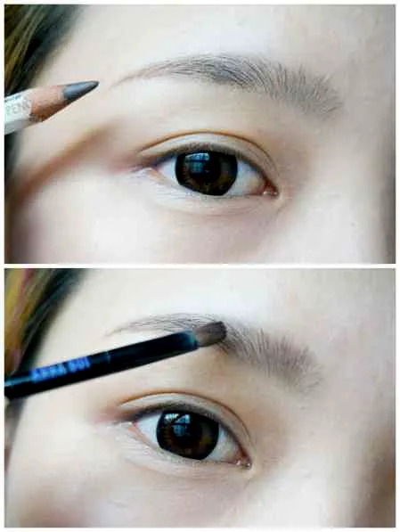 1、画眉毛,韩国妹子的喜欢平眉,用咖啡色的眉笔下手要轻,用眉粉填充。