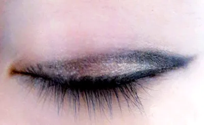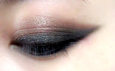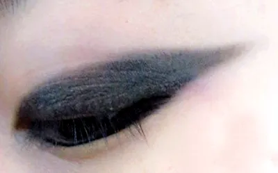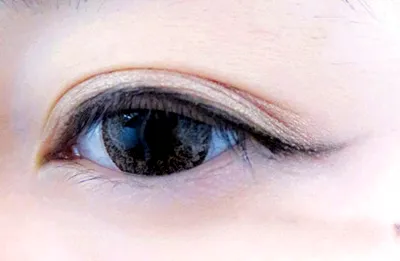 STEP 1:双眼皮的女孩怎么打造孙佳仁单眼皮的眼妆呢?首先,我们用黑色的眼影在睫毛根部画一条长长的眼线,眼尾上翘。
