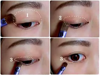 Step6:用眼影刷的侧面蘸取一点的浅棕色眼影,从睫毛根部往双眼皮褶皱推开,形成淡淡的阴影。