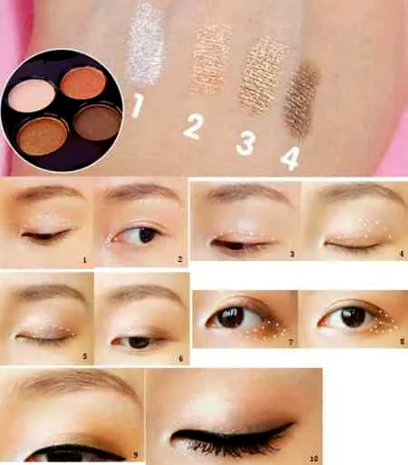 步骤3-4:然后用2号眼影将之刷涂双眼皮及眼线的范围内,眼尾处还要混合3号眼影,均匀的抹开,自然的过度。