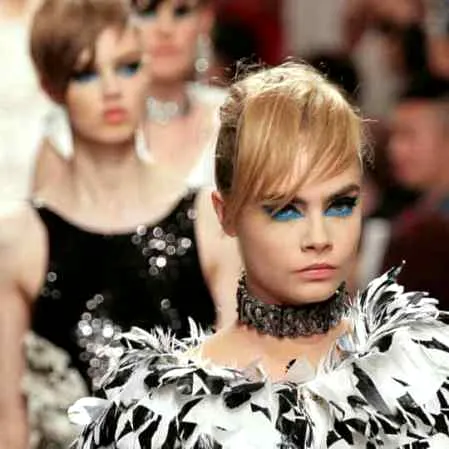 模特Lindsey Wixson和Cara Delevingne展示黑白色调的精致霓裳,复古风刘海,黑色烟熏×荧光蓝眼妆,裸色粉唇,时尚别致的妆容为T台增添了高贵、清新的气质。
