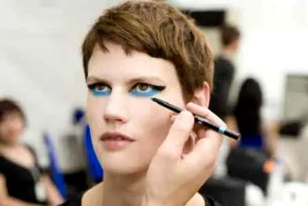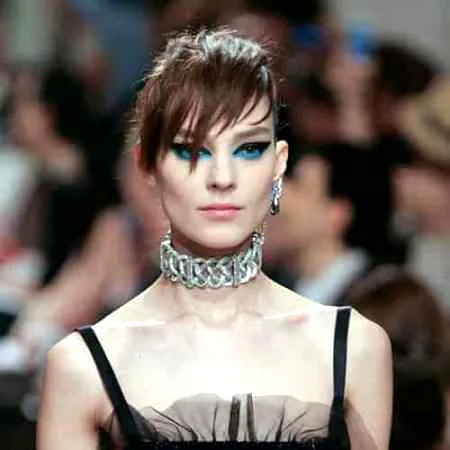 谈及这款眼妆的打造,Peter Philips(化妆师)在上眼皮上应用了风格鬼魅的黑色烟熏眼妆,下眼妆与上眼妆形成强烈的冲突反差:活力无限的电动蓝,颜色让人联想到夏天的海滩,清爽、酷感、时尚。