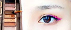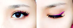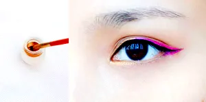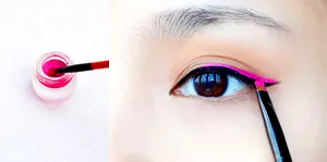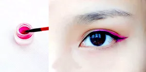4、再用桃红偏紫的眼线膏从眼珠处开始描绘一条细细的线。