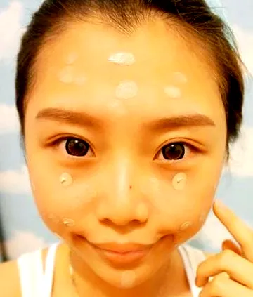 第一步:把BB霜均匀的点在脸上,均匀涂抹,能够快速提亮肤色。