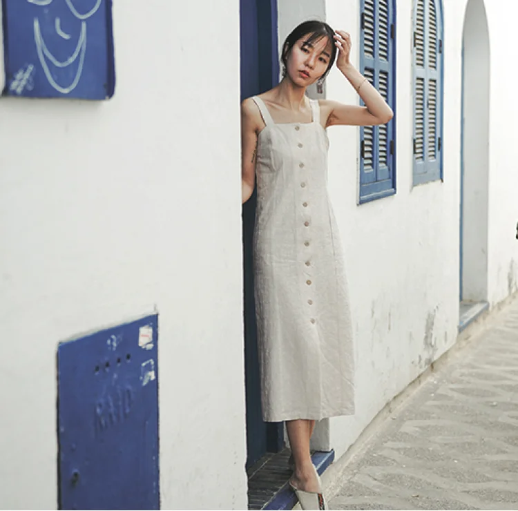 新款纽扣背带裙。非常经典时尚的一款背带裙,全程的纽扣款式简洁但不失简单,面料是采用优质的棉麻面料,穿上去舒适更透气,可水洗超便捷。经典的款式也是极其百搭时尚的。