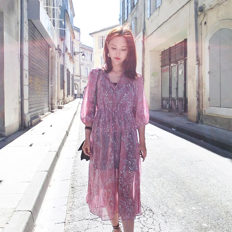 透视网纱V领连衣裙。时尚吸睛的两件套设计,里面的吊带背心是棉质的哦,外面采用最薄的雪纺面料,舒适更透气,加上雕花的工艺设计尽显时尚潮流感,带你玩转夏日出街摆拍。