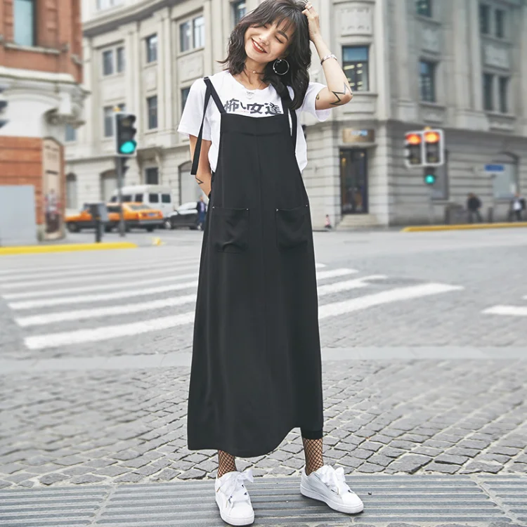 长款黑色吊带连衣裙。宽宽松松的黑背带款式设计看起来就非常喜欢呢,是很随意休闲的欧美款,上身效果也很显瘦呢,后面的开叉设计时尚更美观,简约的时尚百搭的让你轻松穿搭。
