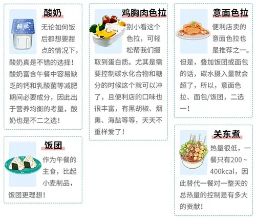 碳水化合物如各式饭团,蛋白质如鸡胸肉色拉、鸡蛋,食物纤维组合如生菜、黄瓜、番茄等。售卖的各式盒装便当,营养均衡,也是减肥期间不错的选择。