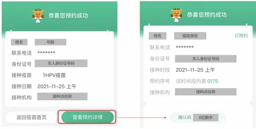 4、预约成功后,点击“查看预约详情”,将获得确认码,收到预约短信,之后请携带相关证件,按预约时间准时前往接种点接种。