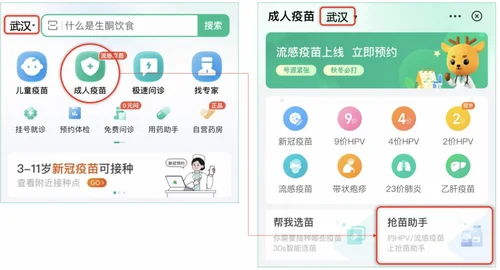 1、进入医鹿APP,定位设置为“武汉”,点击医鹿App首页“成人疫苗” ,进入页面后再点击“抢苗助手”;
