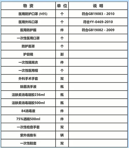 自新型冠状病毒感染的肺炎疫情发生以来,武汉新城医院被征用为医疗救治第四批定点医院,,全体员工正全力突入搭配疫情防控中,实施筑起守护人民健康的防护线,为了更好的救治患者,现急需社会各界依法合规献爱心捐赠防护物资,包括一次性医用口罩、医用防护服、医院外科口罩、医用防护口罩、一次性隔离衣、一次性医用帽、洁肤柔消毒凝胶、84消毒液、一次性检查手套、紫外线推车、一次性鞋套,具体型号如下: