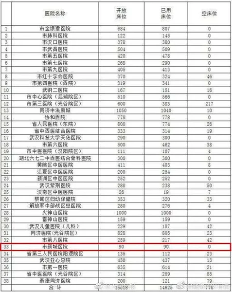 截至2020年2月13日,全市38家定点医院,开放床位15018位,已用床位14625位,空床位776位。而新洲区所属中医医院开放床位252位,已用床位252位,空床位0位。湖北省第三人民医院阳逻院区开放床位135位,已用床位112位,空床位23位。位于阳逻开发区的武汉市新城医院开放床位90位,已用床位90位,空床位0位。