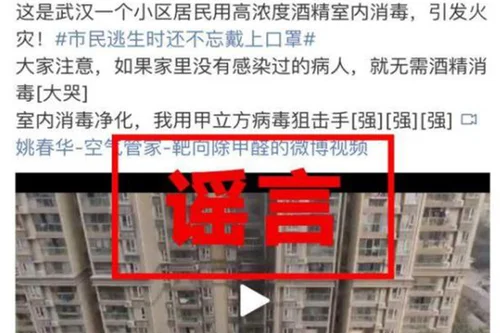 2月3日中午,一段武汉某小区起火视频在网上热转,不少市民传言该事故系在家使用酒精消毒造成。武汉消防在新浪官方微博上紧急辟谣,呼吁市民不造谣、不信谣、不传谣!