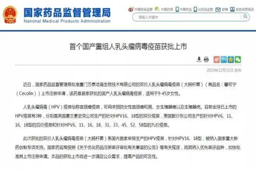 近日,国家药品监督管理局批准厦门万泰沧海生物技术有限公司的双价人乳头瘤病毒疫苗(大肠杆菌)(商品名:馨可宁(Cecolin))上市注册申请。
