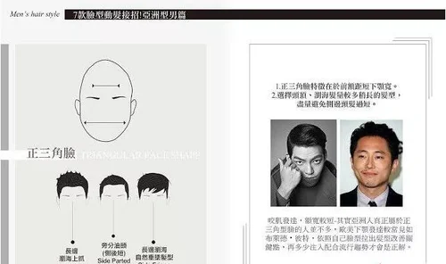 2.选择头顶、浏海发量较多稍长的发型,尽量避免侧边头发过短。咬肌发达,额宽较短–其实亚洲人真正属于正三角型脸的人并不多,欧美下颚发达较常见如布莱德・彼特,依照自己脸型拉出发型改善关键点,再多少注入配合流行趋势才会是正解。